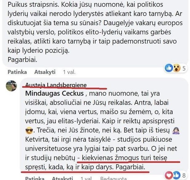 „Kokia jūsų nuomonė, kai politikos lyderių vaikai nerodo lyderystės atliekant karo tarnybą? Ar diskutuojat šia tema su savo sūnumis? Daugelyje Europos valstybių verslo, politikos elito lyderių vaikams garbės reikalas atlikti karo tarnybą ir taip pademonstruoti savo kaip lyderio poziciją“, – rašė gyventojas.