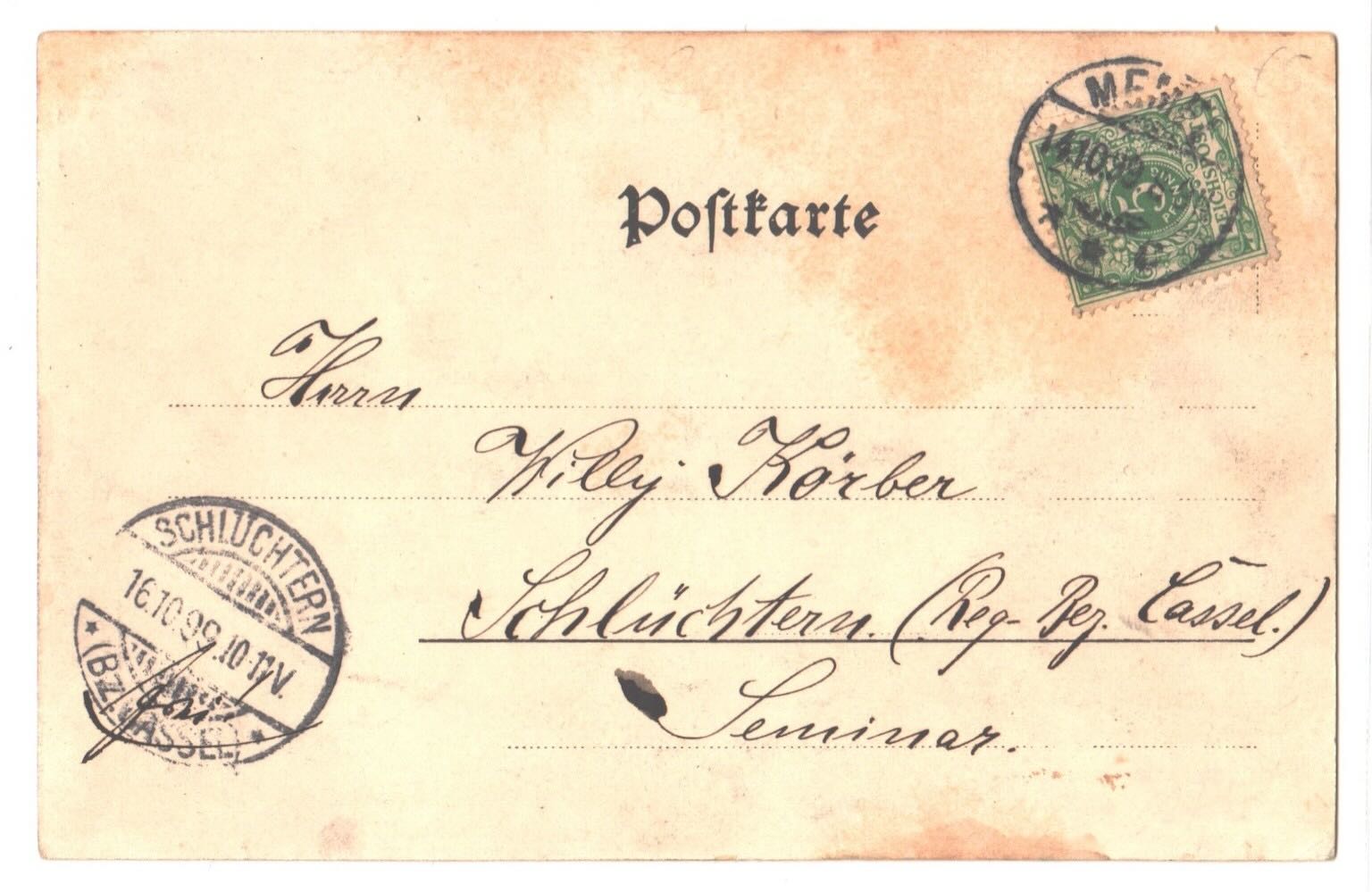 Pastarąjį pasiekė vos po 2 dienų: 1899 m. spalio 16 d. Tai mes galime sužinoti iš atvirlaiškio reverse esančių pašto antspaudų. Stebėtinas operatyvumas: Klaipėdą nuo Schlüchterno tiesia linija skiria net 977 km.