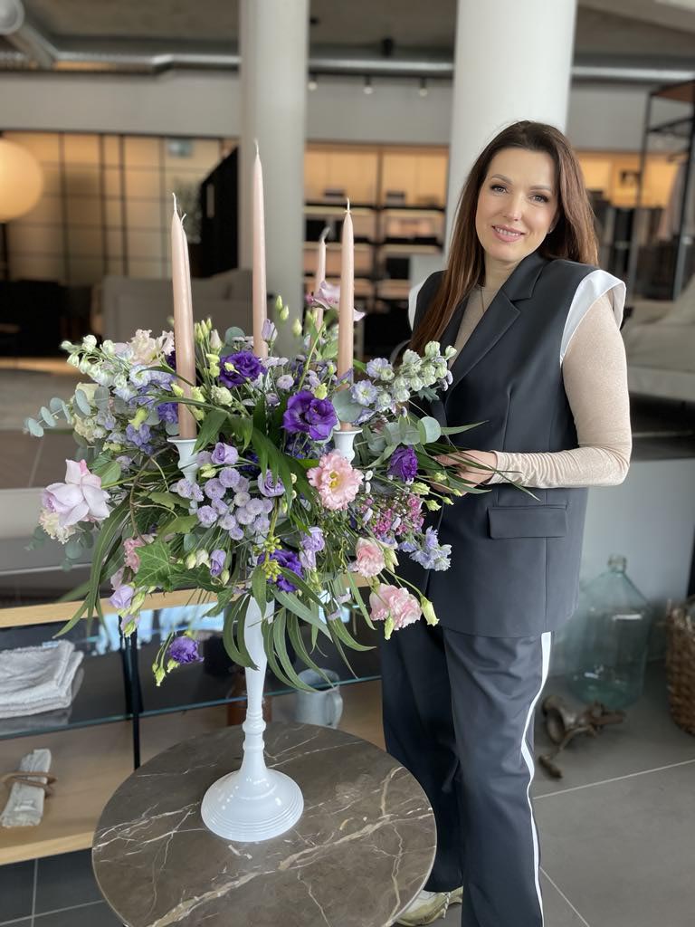 Pavasaris yra tas sezonas, kada pagausėja gėlių asortimentas. Ta proga Kristina savęs neribos ir žaviai kompozicijai sukurti kombinuos įvairiausias gėles: delfiniumus, rožes, eustomas, vaškagėles, dažytas chrizantemas, dviejų rūšių eukaliptus, palmės šakeles bei dažytas beržo šakeles.
