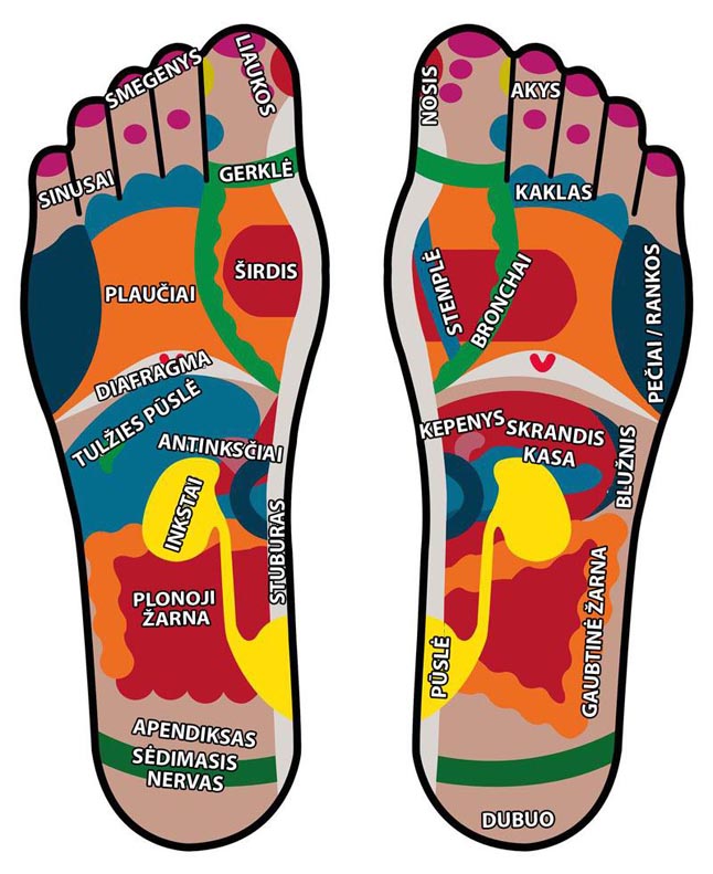 * Yra penki energetiniai kanalai, tarsi vėduoklė išsiskleidę per pėdą. Spausdami plotą nuo vidurio pėdos iki pirštų, atkuriame organizmo energetinį balansą.
