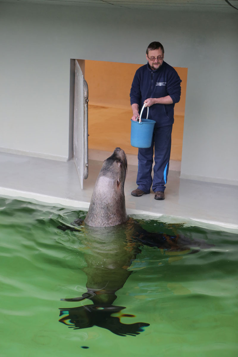 Kol sveikinamės su energingai vandenyje nardančiais ruoniais ir jūrų liūtais, muziejaus biologas-ichtiologas Eugenijus Buivydas atveža jiems maisto. "Tik "šušara": lynai, plakiai, žiobriai... Nepalankios žvejybai sąlygos", - pasiskundžia muziejaus darbuotojas.