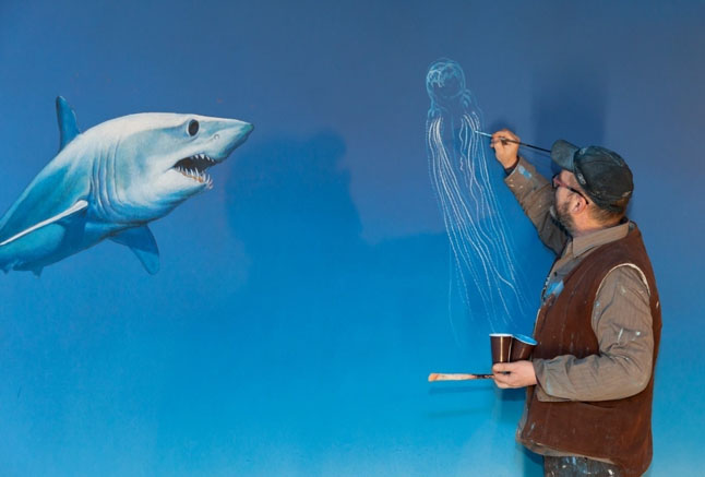Dailininkas Arvydas Brazdžiūnas-Dusė puošia sienas ekspozicijai „Jūra – gyvybės lopšys“. /LJM nuotrauka