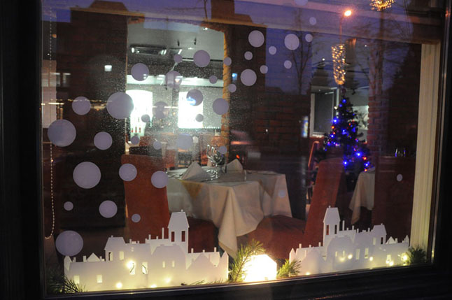 GRAŽIAUSIA VITRINA - viešbučio "Navalis" languose nušvitusios erdvinių namelių kompozicijos.