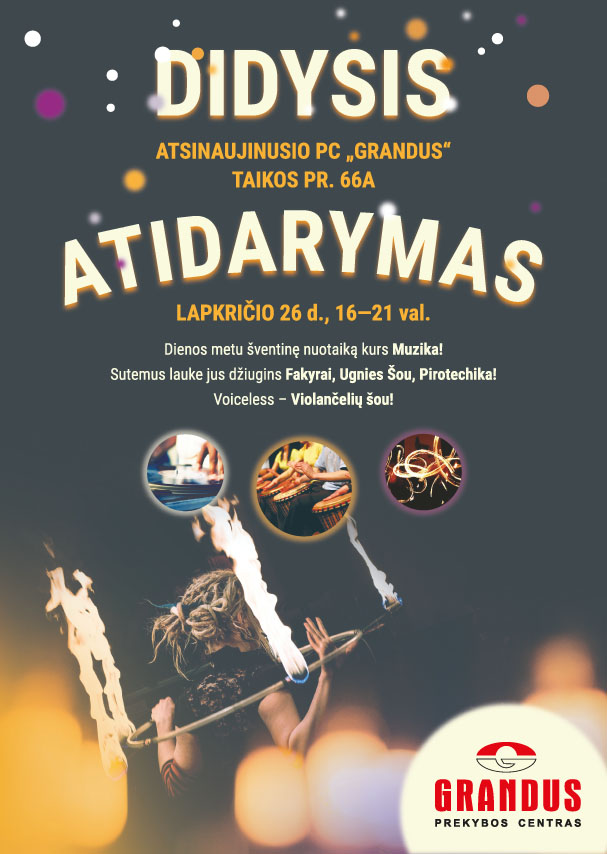 Nuo 16 val. prekybos centro lankytojus linksmins violančelių duetas – “Voiceless”, sutemus lauke pasirodymus rengs fakyrai. Šia proga atsinaujinusiose parduotuvėse klientų laukia nuolaidos ir specialūs pasiūlymai. Kviečiame visus į „Grandus“!
