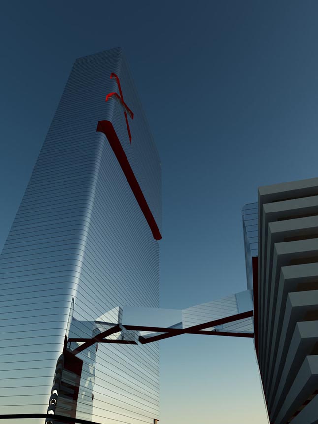 Du 33-37 aukštų dangoraižius šalia Taikos pr. esančios parduotuvės "Elektromarkt" planavusi statyti bendrovė laukia geresnių laikų. "Helios Group" vizualizacija