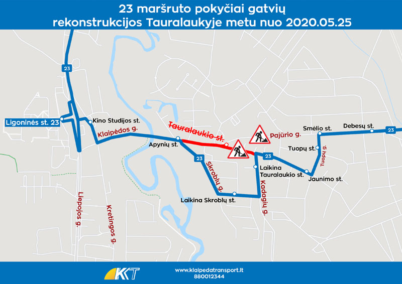 Dėl rekonstrukcijos šiek tiek Tauralaukio atkarpoje koreguojame ir žiedinio 23 maršruto trasą (žr. pridėtą schemą). Šio rekonstrukcijos etapo darbus numatoma pabaigti iki birželio mėnesio pabaigos.