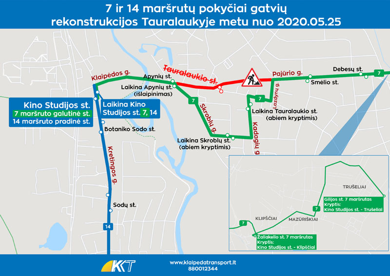 14-ojo maršrutas tam laikotarpiui sutrumpėja iki laikinosios Kino studijos stotelės, kuri bus prieš žiedą link Tauralaukio (žr. pridėtą schemą). O naują reisą centro kryptimi autobusas pradės nuo įprastos Kino studijos stotelės. Atitinkamai šiose stotelėse bus persėdama į/iš 7-ąjį privežamąjį. Pastarojo trasa nukreipiama aplinkinėmis Tauralaukio gatvėmis (žr. tą pačią schemą).