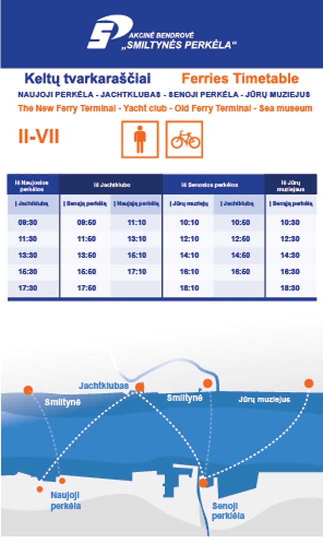 Kol kas AB „Smiltynės perkėla“ keltas keleivius ir dviratininkus naujuoju maršrutu Naujoji perkėla-Jachtklubas-Senoji perkėla-Jūrų muziejus pirmyn ir atgal plukdys 5 kartus per dieną pagal iš anksto suderintą grafiką. Esant poreikiui, reisų skaičius didės. Transportas šiuo maršrutu nebus keliamas.