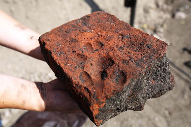 ATSPAUDAS. Archeologai piliavietėje atrado ir plytą, kurioje likęs šuns letenos atspaudas.