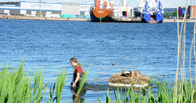 Paskui braunantis per nendryną naujasis gulbių "butas" su vaikučiais buvo stumiamas į kitą, saugesnę vietą, kur darbai nebus atliekamai dar kurį laiką. Gulbių pora graudžiai ir taikiai plaukiojo aplinkui. Jos nebesidomėjo gulbiukais naujame lizde naujoje vietoje, tad lizdą teko grąžinti vos ne į tą pačią vietą.