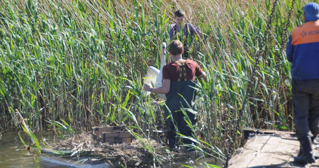 ATGAL. Ornitologui Juliui Morkūnui teko naują lizdą su gulbiukais grąžinti atgal, nes gulbės taip toli neieškojo savo jauniklių.
