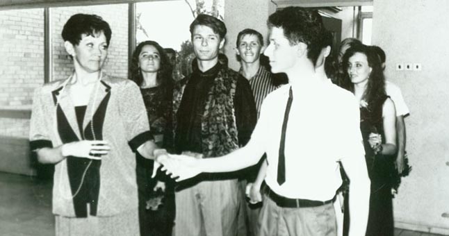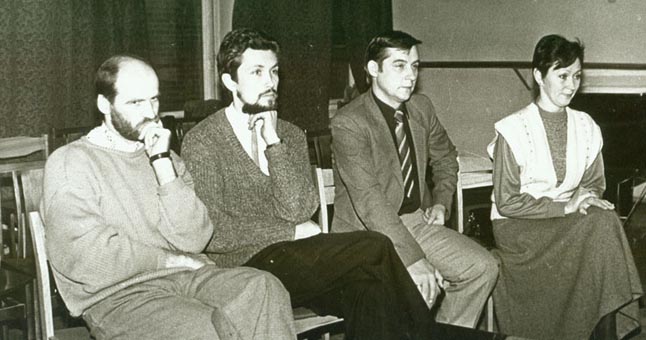 | Buvo metas, kai Sportinių šokių katedros dėstytojai studentus egzaminuodavo Statybos tresto kultūros namų salėje. Šioje nuotraukoje egzaminus priiminėja katedros dėstytojai (iš kairės) Algis Poškis, Paulius Sangavičius, Romaldas Idzelevičius, Skaistė Idzelevičienė. |