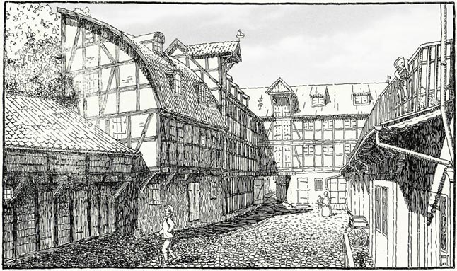 KIEMAS. Daržų (buvusios Kirpėjų - Baderstrasse) gatvės 10-ojo namo kiemas su pirkliams Adomaičiams priklausiusiu sandėliu 1921 m. Piešinio autorius - statybos meistras Hameris.