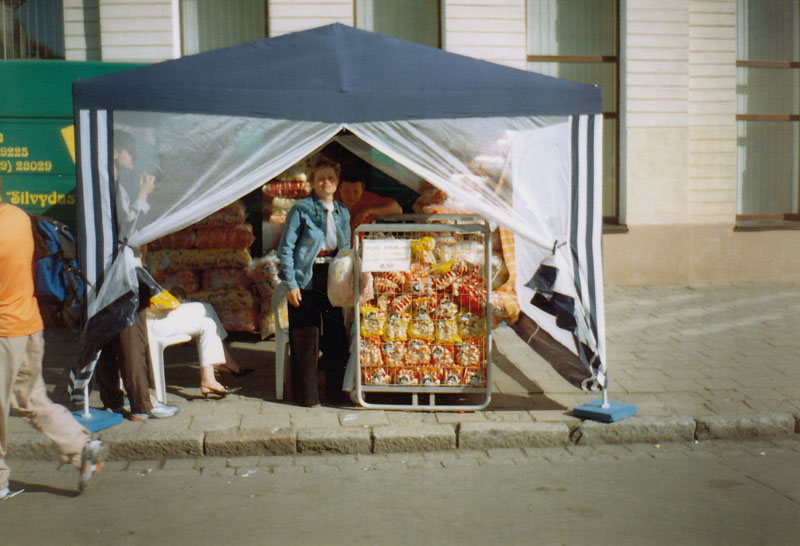 KUKURŪZAI. Vienu metu Plauškai vertėsi kukurūzų lazdelių gamyba ir prekyba. "Gyventojams leisdavo prekiauti prie savo gyvenamųjų namų. Tereikėdavo tik mokestį už šiukšles susimokėti. Šioje nuotraukoje biznis vyksta prie bibliotekos langų.