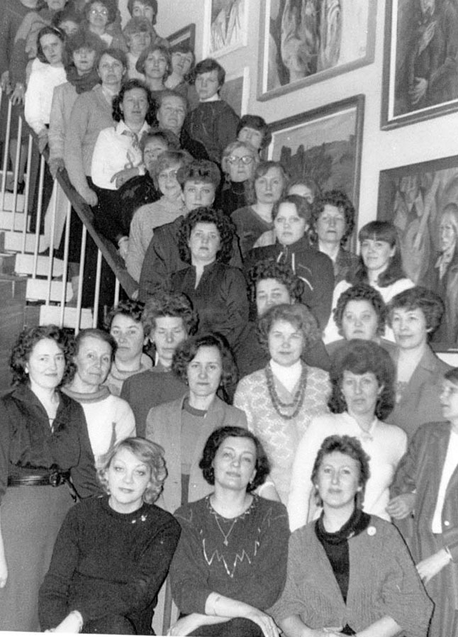 KOLEKTYVAS. 1985 m. bibliotekos širdyje pastate Turgaus g. 8 bibliotekininkės iš 6 skyrių ir 11 padalinių fotografavosi ant laiptų, kurie per įvairius renginius tampa ir bibliotekos lanytojų "sėdimomis vietomis", kai pristinga kėdžių.