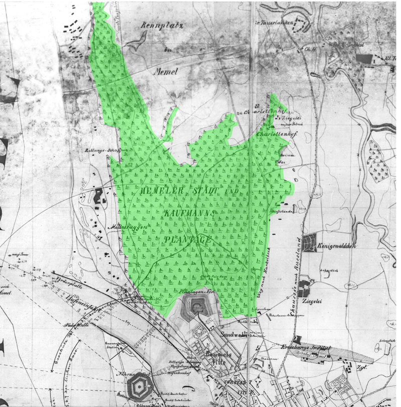 XIX a. pab. žemėlapis, kuriame matyti, koks plotas Plantacijoje buvo apsodintas medžiais XIX a. aštuntajame dešimtmetyje ir kaip Plantacijos fortas įsiterpė į parko teritoriją.
