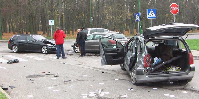 Antanas, vairavęs "Peugeot 307", įvažiavo į sankryžą ir susidūrė su pagrindiniu keliu važiavusiu automobiliu "BMW 330", kurį vairavo 37-erių metų Filipas B. Po smūgio "Peugeot 307" pakeitė važiavimo kryptį, apsisuko apie savo ašį ir čiuoždamas atkišo kitą šoną šalutiniame kelyje stovėjusiam automobiliui "Peugeot 407", kurio vairuotojas Ignas (gim. 1983 m.) tuo metu buvo sustojęs prie kelio ženklo "Stop". Staiga į jį atskriejo kitas "Peugeot". Automobilis gavęs iš abiejų šonų, sukiužo, iš jo iškrito atsarginis ratas. Visuose automobiliuose iššaudė saugos pagalvės.