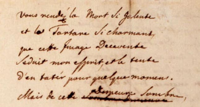 FRYDRICHO II laiško Volterui fragmentas (Potsdamas, 1747 m., balandžio 24 d. rankraštis, saugomas Vokietijos istorijos muziejuje).