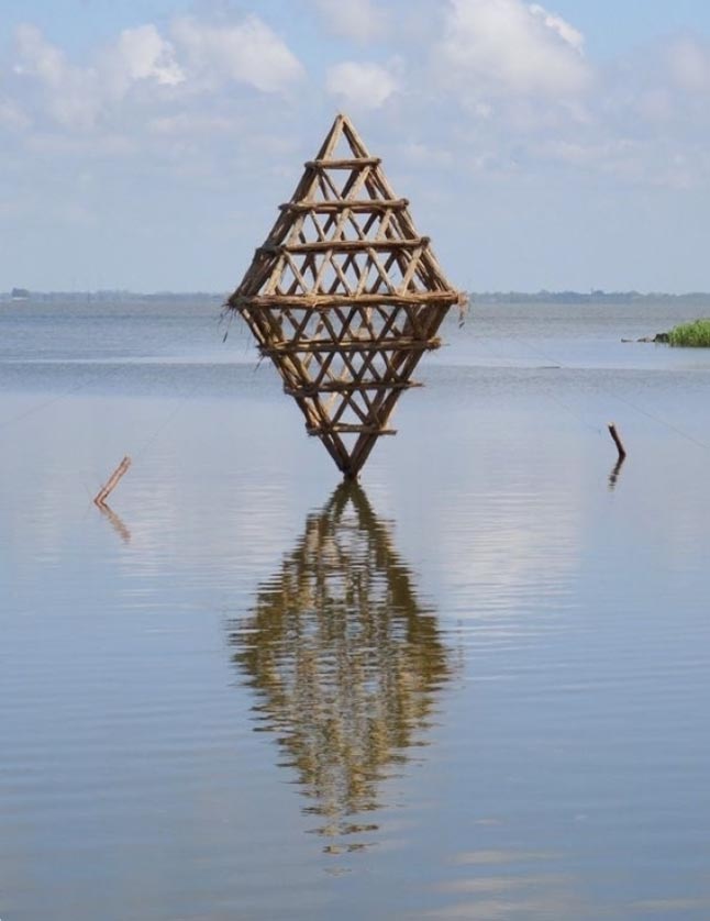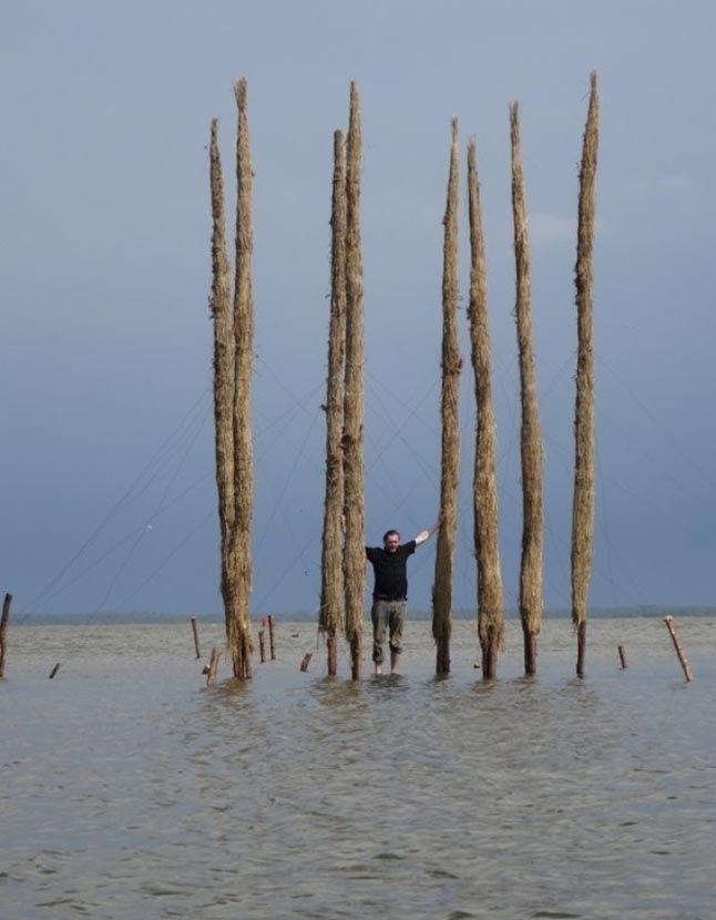 „Ten dumblo storis gal 2 metrai. Viena buvo skulptūras sukurti krante, o visai kas kita – jas nuplukdyti į įlanką ir ten pritvirtinti. Pavyzdžiui, „Šventyklėlei“ prireikė net 64 atotampų, laikančių įspūdingas „žvakes“. Į pagalbą atėjo mūsų parko direkcijos žmonės, žvejai, nes skulptūros plukdytos dviem valtimis“, - pasakojo ji.