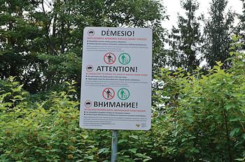 Viršum poilsiavietės suolų įtvirtinta masyvi lentelė skelbia: „Dėmesio: neplatinkite afrikinio kiaulių maro, nepalikit maisto, šiukšlių“. „Paradoksas, tačiau tuo, kad žmonės nepaliktų šiukšlių ir žarnyno turinio, nepasirūpinta. Lengviausia – uždrausti, o ką žmonėms daryti, jei eiti į tualetą – normalus biologinis procesas“, – svarstė pašnekovai.