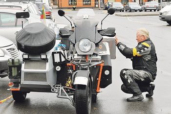Į akis pirmiausiai krinta ant triračio motociklo sumontuotos automobilio padangos, – jos reikalingos tam, kad keliautojai galėtų įveikti dykumą, vandenį, purvą. „Taip važiuoti yra stabiliau – padidėja sukibimo plotas, ne kaip judant įprastomis padangomis, – savojo motociklo pranašumus vardino jo šeimininkas. – Šitas motociklas turi tokius pačius mechanizmus, kaip ir keturratis, – vadinamąja gerve jį galima pakelti arba nuleisti po 10 cm“.