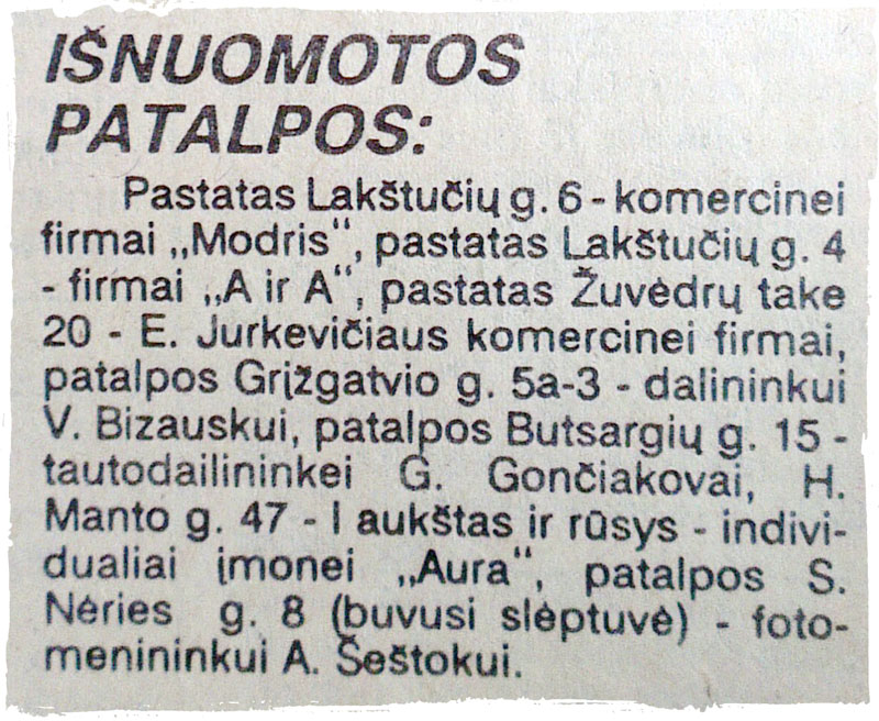 "Buvo parduotas kitas avarinis pastatas Naujojoje Uosto g. 8. Pradinė pardavimo kaina gana aukšta - 108 000 rublių. Nors varžėsi keturios fizinių asmenų grupės, bet naujasis savininkas pastatą įsigijo pigiai - tik už 152 000 rublių. Nupirko Vytauto Rickaus grupė (89 žmonės).