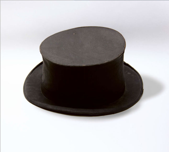 Vyriška skrybėlė cilinderis Klaipėda, XX a. I pusė. Cilinderis aptrauktas juodu atlasu, pažymėtas firminiu ženklu Reform patent klapphut