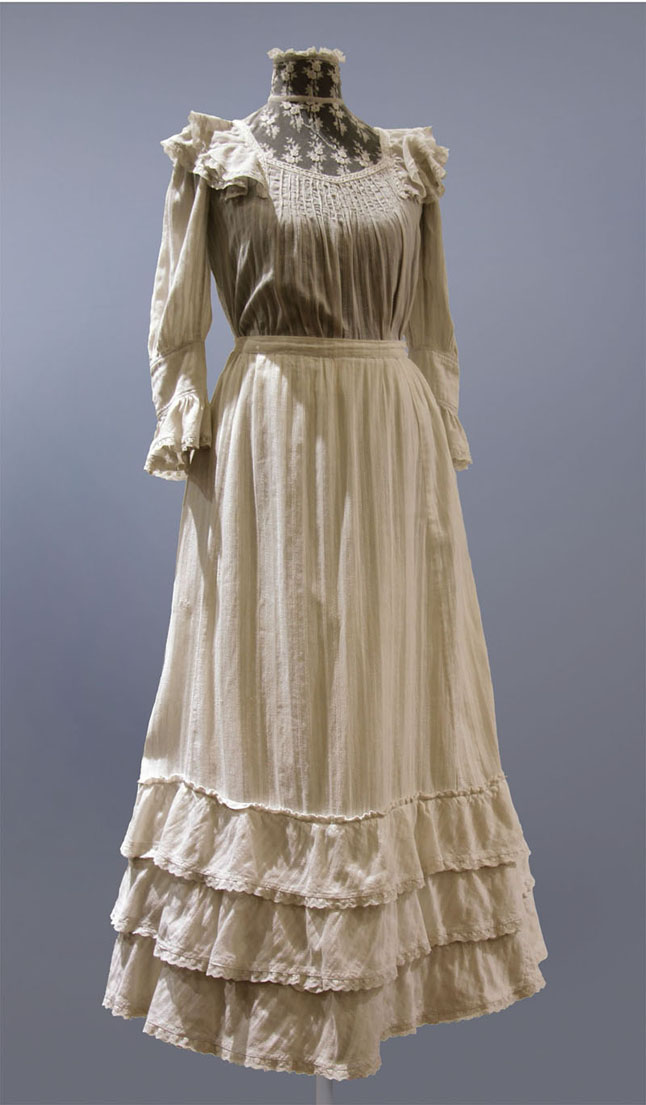 Taftinė bliuzė - pastatytais pečiais. Ant stačios apykaklės neretai buvusi užversta dar ir balta pinikiuota. Ta, kuri siuvosi vestuvinius drabužius pagal vokišką madą, dėvėjo baltą vestuvinę suknelę, puošėsi šydu, o rankose laikė baltų gėlių puokštę.