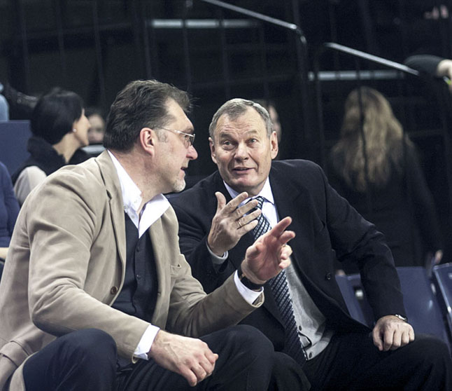 Dvi Lietuvos krepšinio įžymybės - Arvydas Sabonis (kairėje) ir Modestas Paulauskas turi apie ką pakalbėti. Viktoro PURIO nuotr.