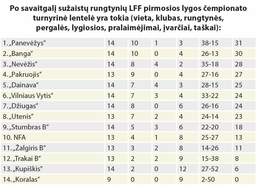 Pergales iškovojo čempionate pirmaujančios komandos. Lyderiai "Panevėžio" futbolininkai išvykoje 4:2 nugalėjo "Pakruojo" klubą, o į antrąją vietą pakilusi Gargždų "Banga" taip pat varžovų aikštėje 2:0 privertė pasiduoti Nacionalinės futbolo akademijos ekipą. Kitose rungtynėse Vilniuje "Trakai B" sužaidė lygiosiomis (2:2) su Alytaus "Dainava".