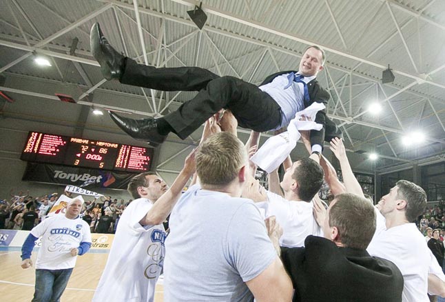 PERRAŠĖ ISTORIJĄ. Klaipėdos "Neptūno" krepšininkams pernykštis sezonas buvo išskirtinis - pirmą kartą istorijoje iškovoti bronzos medaliai, o treneris Kazys Maksvytis žaidėjų buvo mėtomas į orą. Norėtųsi, kad ir šiemet sezono finišas būtų kupinas džiugių emocijų. Viktoro PURIO nuotr.