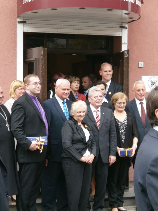 VIZITAS. Pernai Klaipėdos krašto vokiečių bendruomenę aplankė garbus svečias - Vokietijos prezidentas Joachimas Gauckas (Joachim Gauch) (trečias iš dešinės). Šalia - Magdalena Piklaps, Klaipėdos meras Vytautas Grubliauskas, Lietuvos evangelikų liuteronų bažnyčios vyskupas Mindaugas Sabutis.