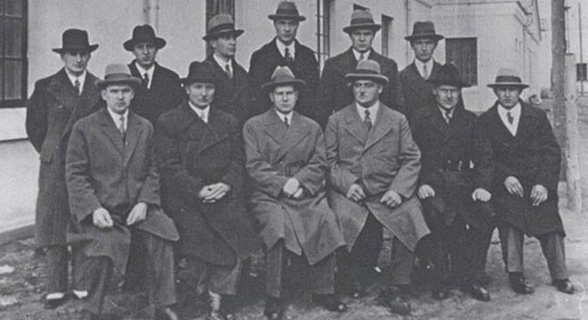 NARYS. Vladas Grudzinskas (pirmoje eilėje trečias iš kairės) tarp "Maisto" bendrovės kolegų. Mažosios Lietuvos istorijos muziejaus fondų nuotr.