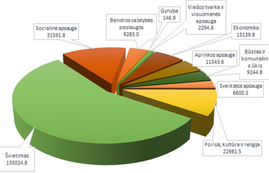Švietimo funkcija finansuojama iš dviejų šaltinių - iš savarankiškosioms funkcijoms vykdyti skirtų lėšų ir iš specialios tikslinės dotacijos ugdymo reikmėms finansuoti. Savivaldybės biudžeto asignavimai paskirstyti savivaldybės vykdomoms funkcijoms finansuoti (išlaidų struktūra pagal funkcijas pavaizduota 2 diagramoje, tūkst. Eur).