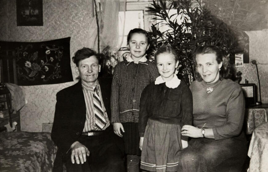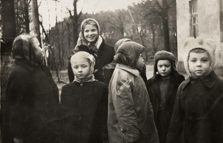 Pokariniame kurhauze, virtusiame „komunalke“, buvo apgyvendintos įvairių tautybių šeimos - su skirtinga gyvenimo, o ir kultūrine patirtimi. Bet, pasak p. Nijolės, atšiauraus gyvenimo sąlygos netrukdė sugyventi be ypatingų skandalų. Pirmoje eilėje antroji iš kairės Nijolė Montvilaitė, virš jos - sesė Birutė.