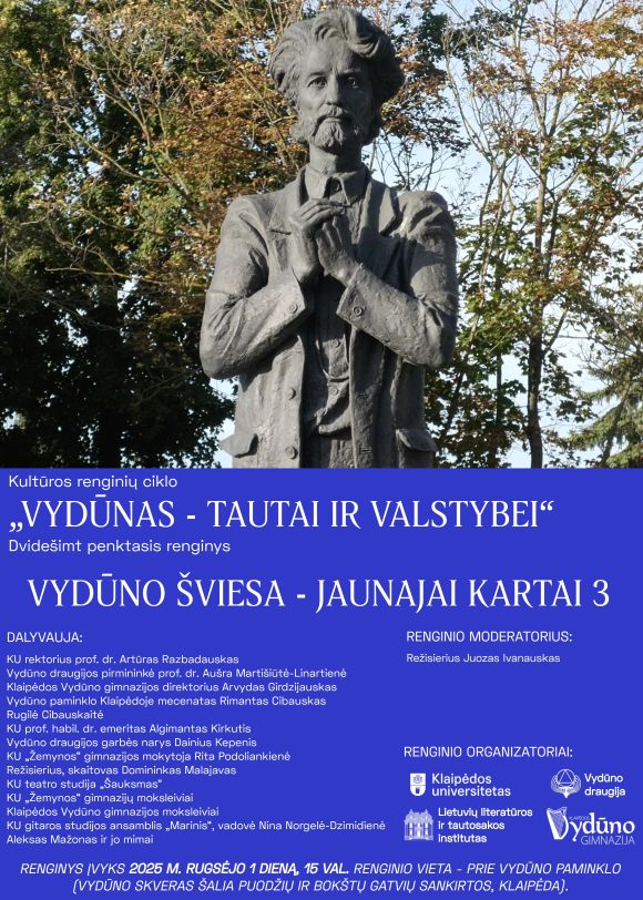 Jūsų dėmesiui Klaipėdos universiteto, Vydūno gimnazijos bei Vydūno draugijos kultūros renginio "Vydūno šviesa - jaunajai kartai"-3 programa ir plakatas.