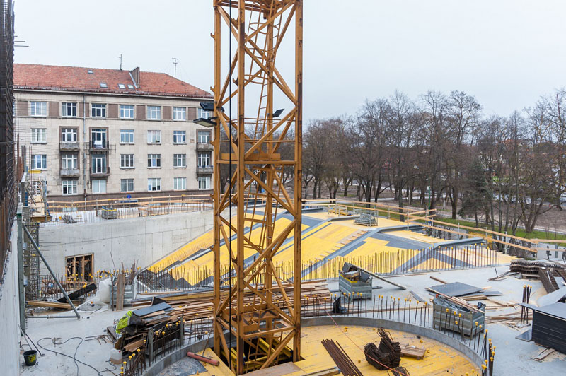"Šiuo metu jau kylame į antrą, trečią priestato aukštus. Būsimos didžiosios salės vietoje, kuri taip pat bus priestate, dabar surinkinėjama tribūninė perdanga, ant kurios montuosis žiūrovų kėdės. Didžioji žiūrovų salė - sudėtingos 3D formos: su išgaubimais visomis kryptimis, specialiais laiptais, turinti kelis šimtus skylių iš apačios ateinančiam tyliam vėdinimui įvesti.