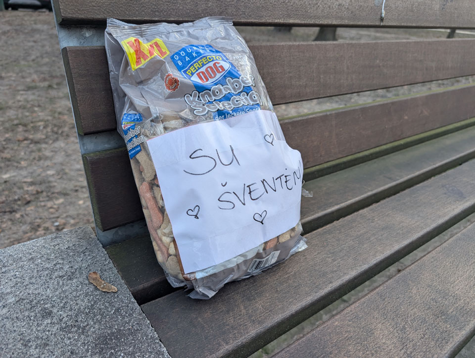 (3)Birutės gatvėje, tarp daugiabučių namų esančioje erdvėje, kurioje vietiniai gyventojai vedžioja savo šunis, gruodžio 24-ąją ant suoliuko paliktas didžiulis maišas keturkojams skirtų skanėstų.