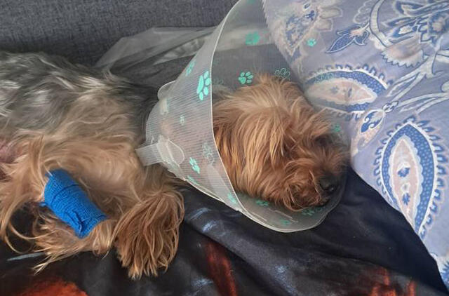 Įbėgus į netoliese esančio namo laiptinę pastebėta, kad terjeras kraujuoja, pristačius jį veterinarams šie kritinių sužalojimų nenustatė, tik kastinę žaizdą gyvūnėlio pilve, artimiausiomis dienomis turėtų paaiškėti, ar jo būklė neblogės.