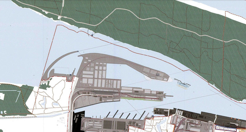 Anksčiau planuota, kad uosto pietinių vartų kompleksą sudarys apie 1,24 km ilgio pietinė damba ir apie 0,88 km ilgio šiaurinė damba.