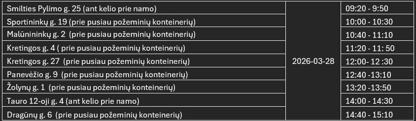 Primename, kad Klaipėdos mieste draudžiama tokias atliekas palikti šalia konteinerių. Gyventojų patogumui du kartus per metus jos surenkamos apvažiavimo būdu – atliekų surinkimo transportas atvyksta į gyvenamuosius kvartalus, o gyventojai atliekas gali atnešti ir perduoti atliekų tvarkytojams.