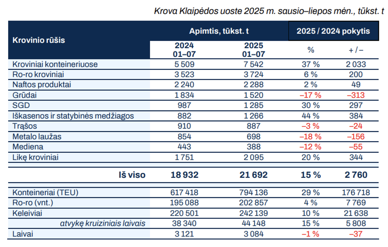 Kroviniai konteineriuose šiuo metu sudaro 35 proc. visų per sausio–liepos mėnesius krautų krovinių. Palyginti šį laikotarpį su tuo pačiu metu pernai, šių krovinių srautas išaugo 37 proc. ir šiuo metu jau perkrauta 7,5 mln. tonų krovinių konteineriuose.