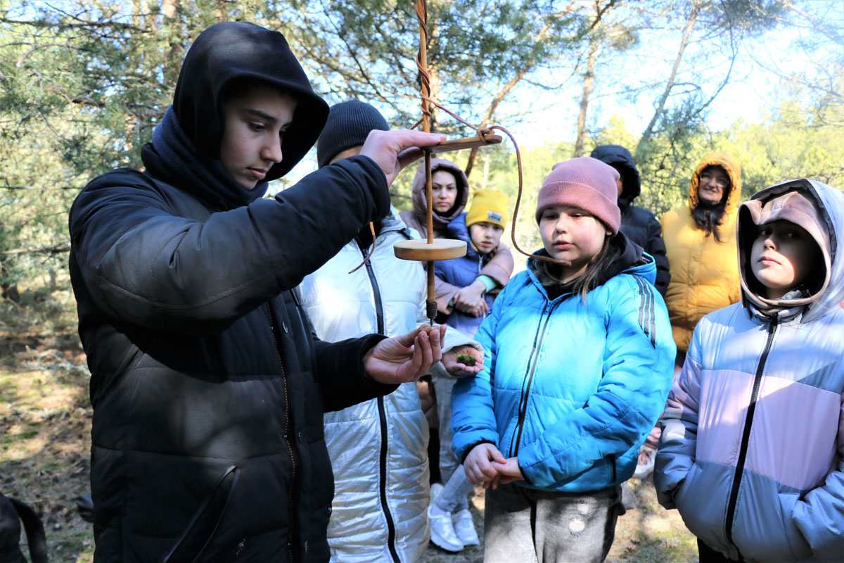 Būtų nuodėmė nepapasakoti svečiams apie mūsų, lietuvaičių pasididžiavimą gintarą. Jaukioje sulėkaitoje, pušynėlyje ukrainiečiai išgirdo istoriją apie Nidos akmens amžiaus gyvenvietę, išvydo vadinamojo Juodkrantės neolito gintaro lobio amuletų kopijas, tačiau didžiausia atrakcija laukė bandant patiems pabūti akmens amžiaus žmonėmis.