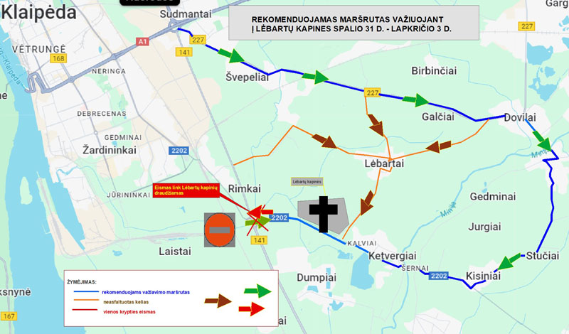 Automobilių vairuotojai, vadovaudamiesi laikinaisiais kelio ženklais, į Lėbartų kapines galės nuvažiuoti per Kiškėnus, Dovilus, Šernus, Rimkus, Šilutės keliu.