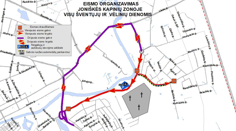Važiuojantieji į Joniškės kapines iš šiaurinės miesto dalies, turėtų važiuoti Liepų gatve ir sukti į Joniškės gatvę.