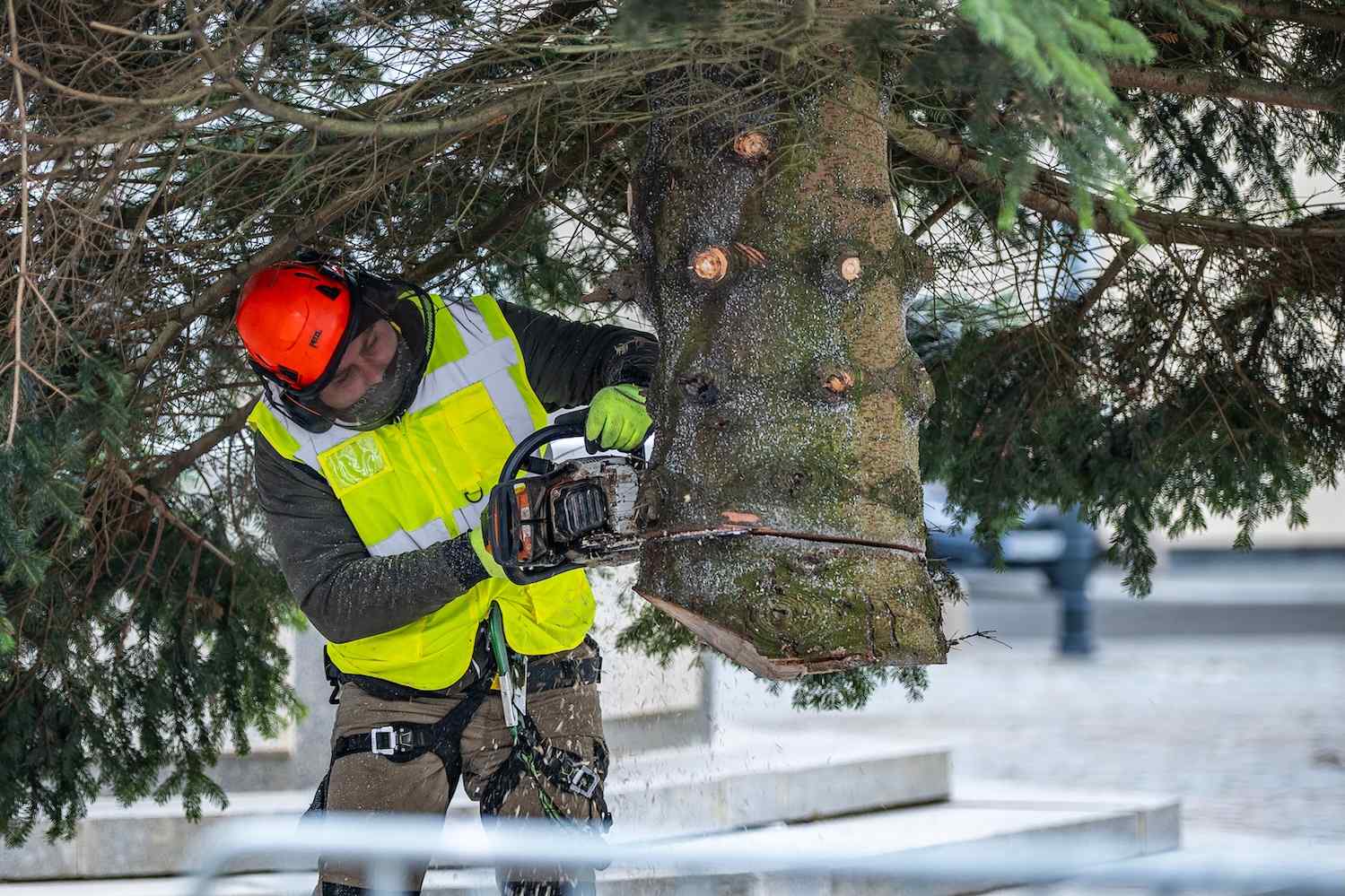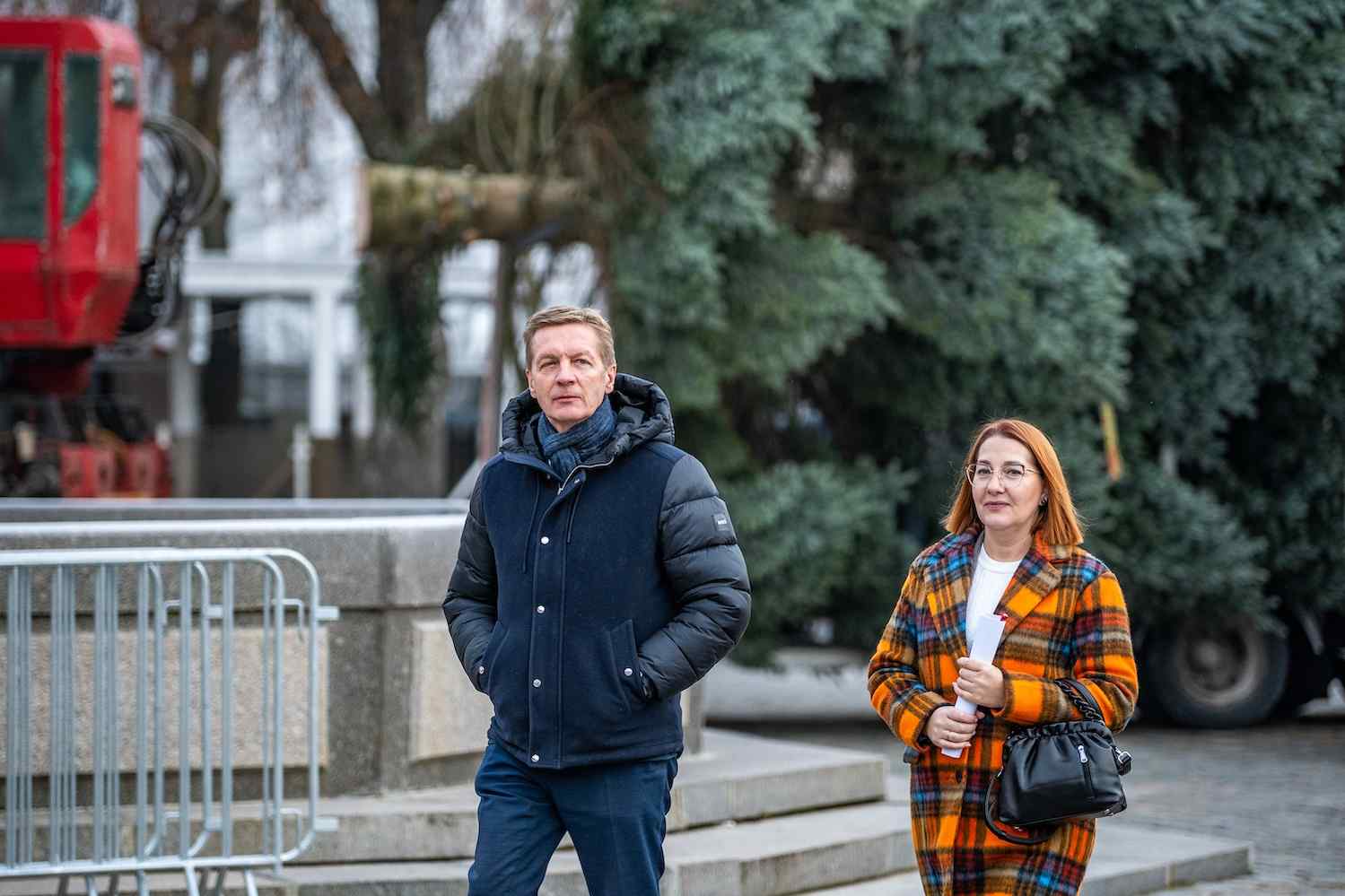 Pirmadienio rytą į Klaipėdos Teatro aikštę atkeliavo svarbiausias Kalėdų simbolis – eglutė, kurią jau dešimtą kartą kviesti dovanoti klaipėdiečiai.