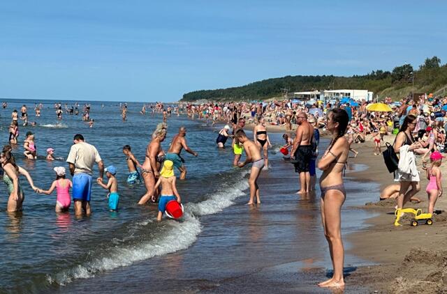 Pliaže žmonių - tūkstančiai, daugybė besimaudančiųjų.