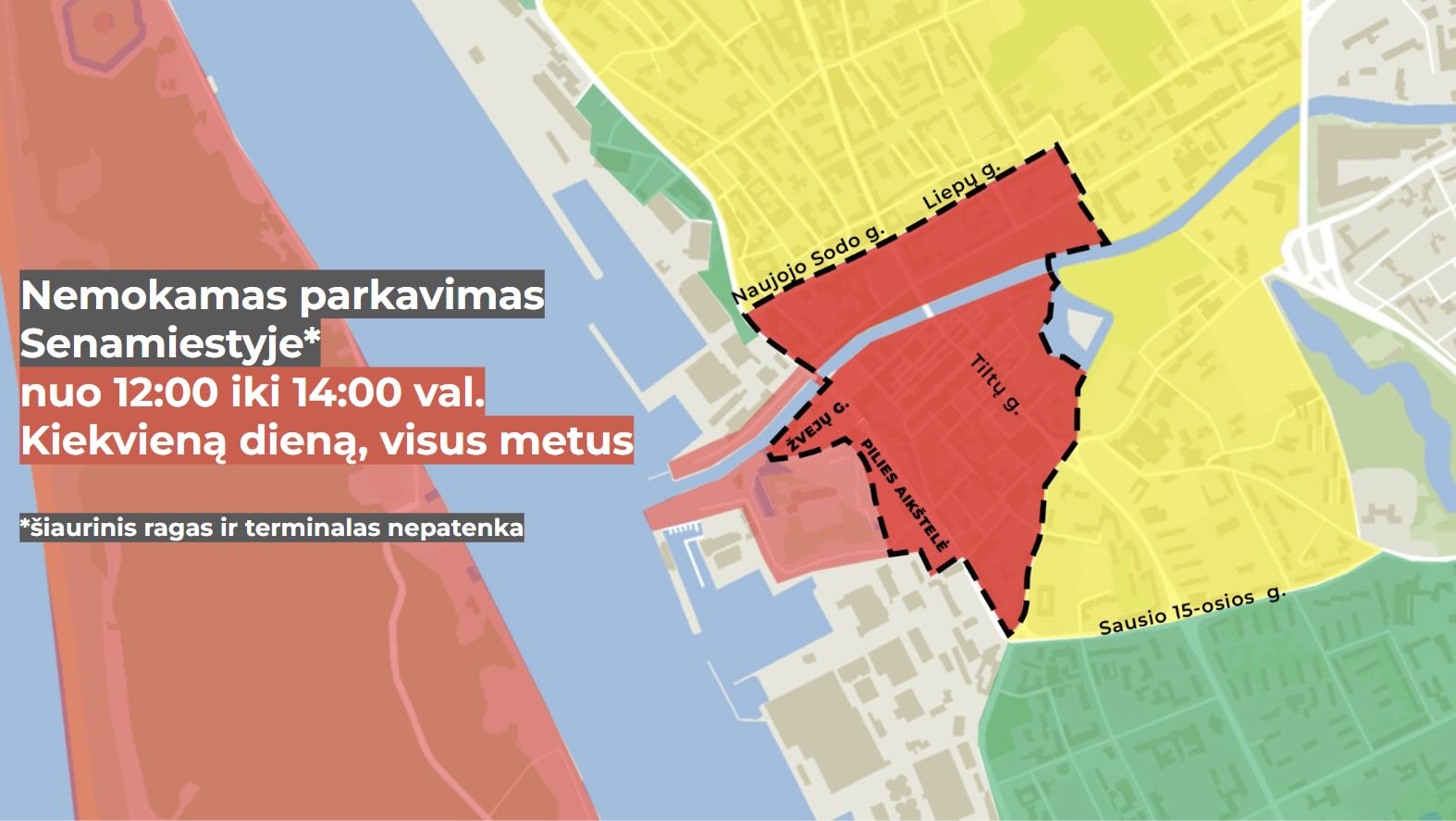 Taip pat galioja ir anksčiau priimtos lengvatos, taikomos šaltojo sezono metu – nuo rugsėjo 16 d. iki balandžio 30 d. savaitgaliais ir švenčių dienomis automobilius piliavietės aikštelėje bei Žvejų gatvės dalyje galima statyti nemokamai.