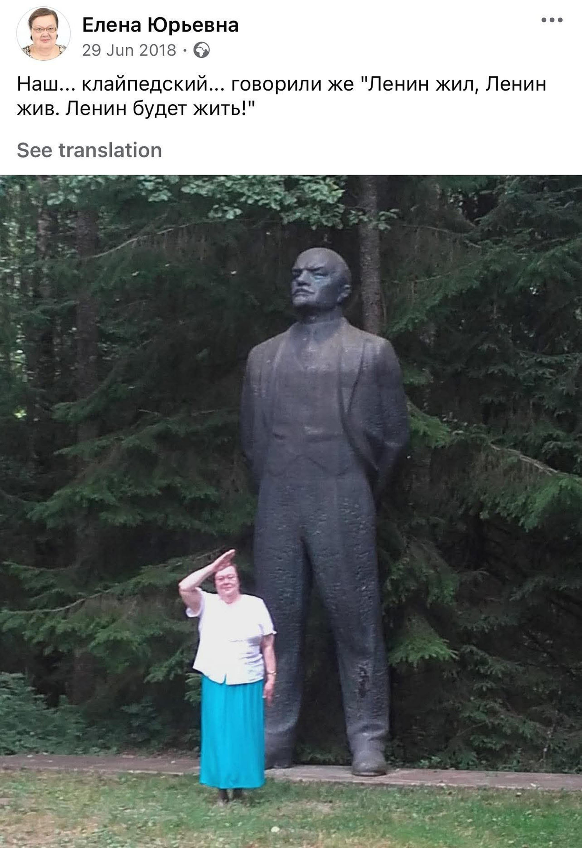 „Tokia atmosfera yra rusiškose Lietuvos mokyklose, nes šioje nuotraukoje - Klaipėdos „Žaliakalnio“ mokyklos direktoriaus pavaduotoja“, - rašė N. Puteikienė, pasidalindama 2018 metų nuotrauka, kurioje matoma „Žaliakalnio“ gimnazijos direktoriaus pavaduotoja ugdymui Jelena Lukjanova, saliutuojanti prie Lenino paminklo Grūto parke su užrašu „Leninas gyveno, Leninas gyvas, Leninas gyvens“.