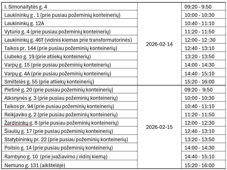 Vasario 14-15 dienomis atliekų vežėjai atvyks į šias Klaipėdos miesto vietas: